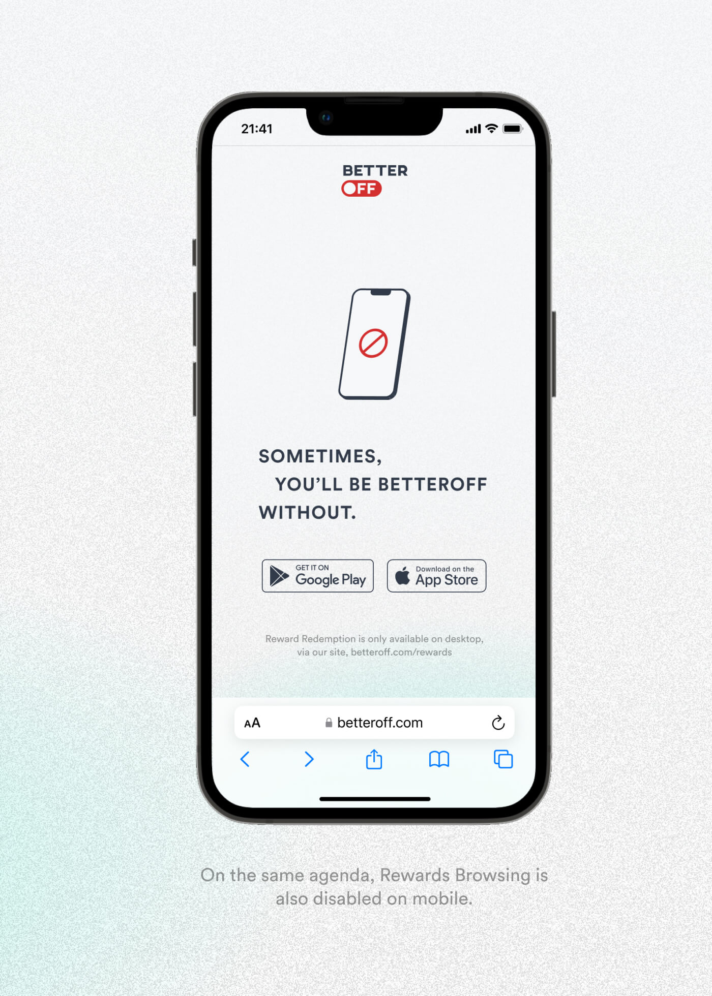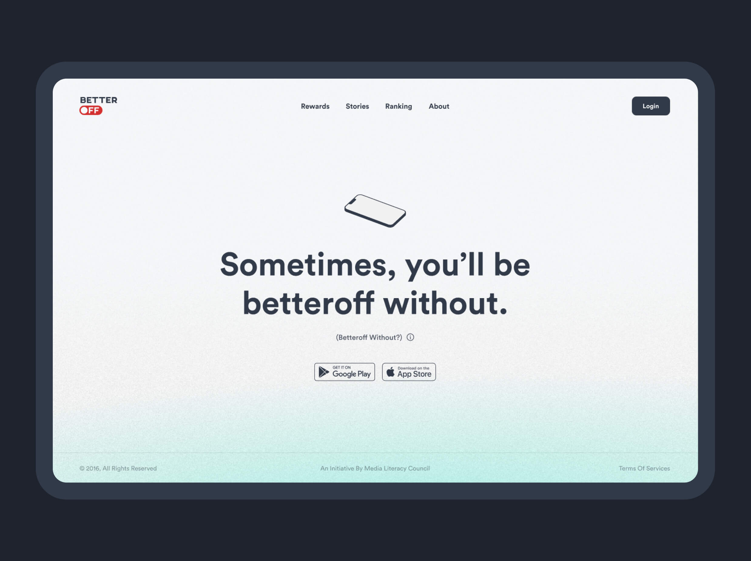 Betteroff is a conceptual campaign that encourages life BetterOff without heavy smartphone usage. The campaign aims to advise rather than lecture, it also uses humor to present its message which allows for better relatability & shareability to audiences. The campaign consists of a TVC, a series of print ads, a microsite and a mobile app.