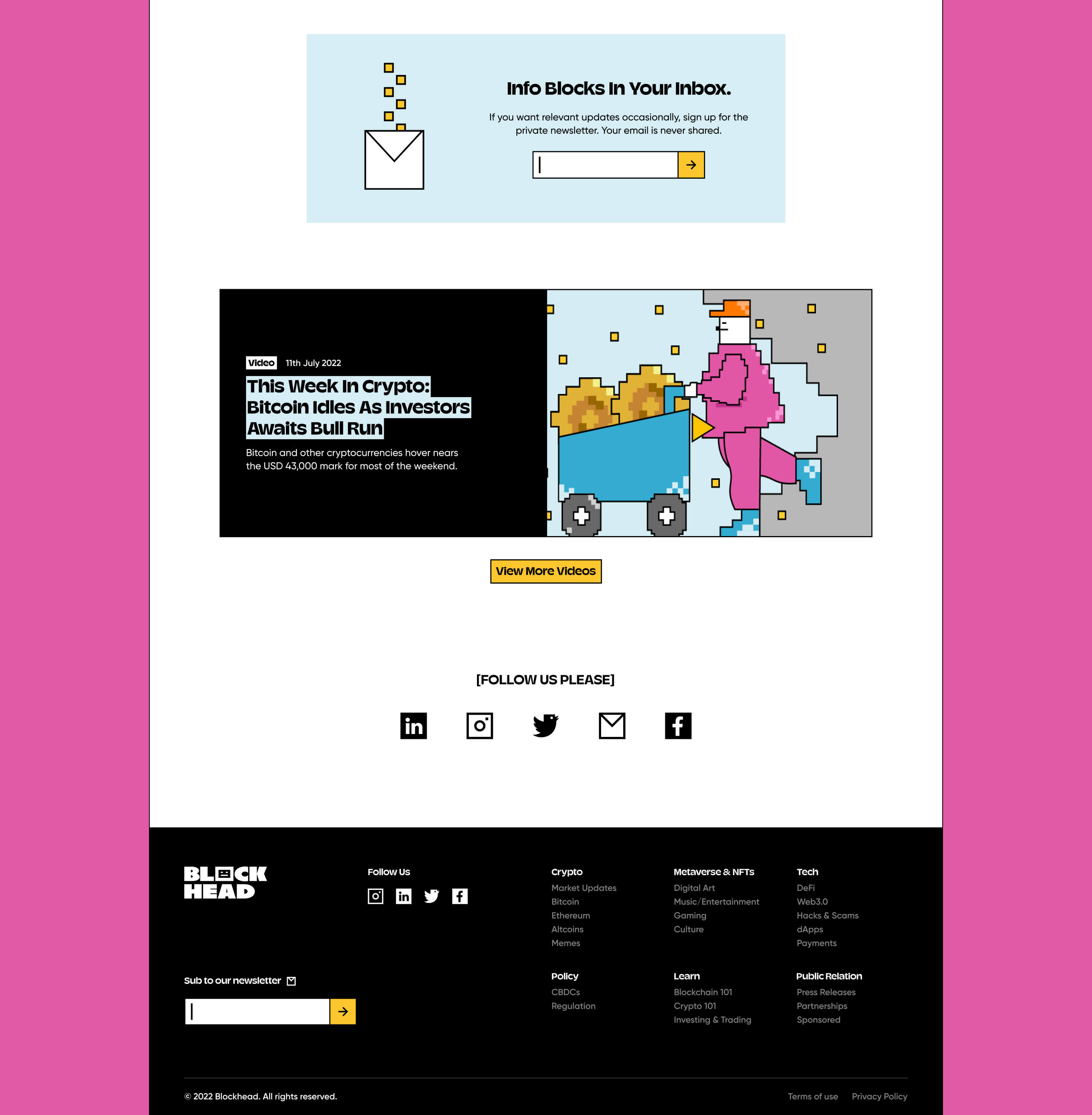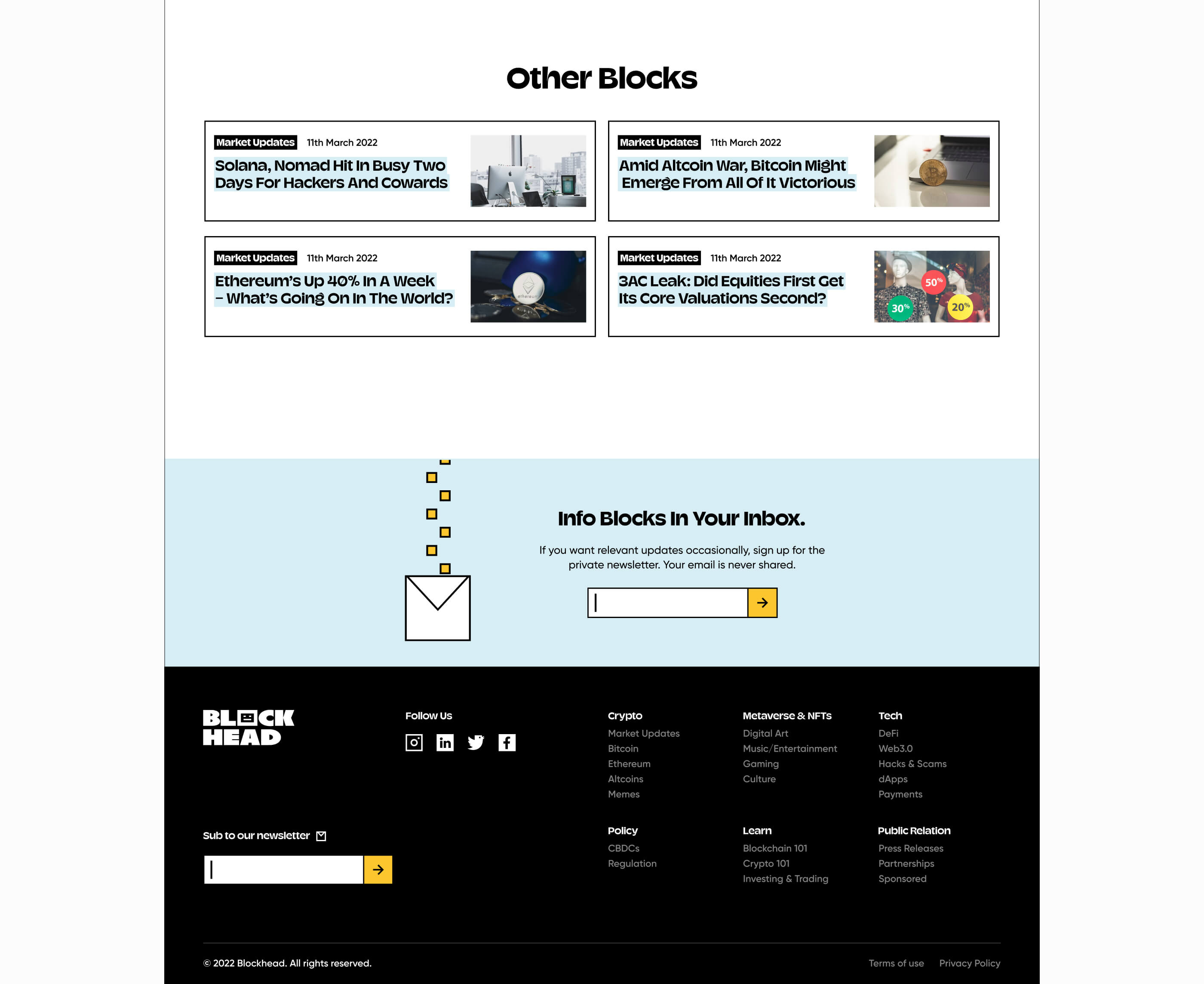 We worked quickly with Blockhead, working to understand the type of content they had planned, and features they needed, cementing a base for how to structure the site. We then adapted the site design to their new branding, ensuring brand visuals stay consistent throughout all of Blockhead's touch points. With the tight timeline, we have also created some of the assets in-house to better illustrate Blockhead's messaging. At the end of the month, we created a platform that Blockhead can proudly use to educate and inform about the wild, mystic world of cryptocurrency.