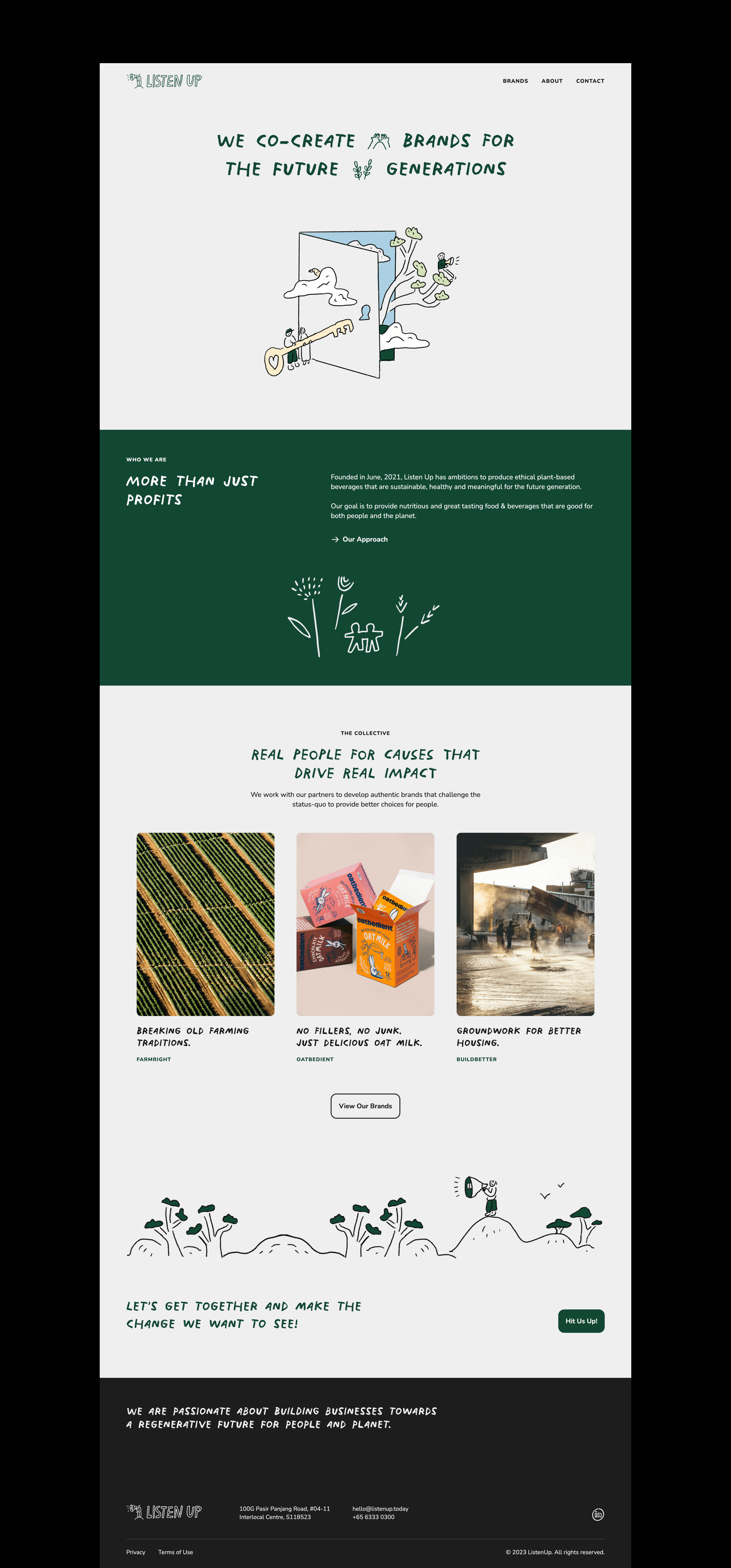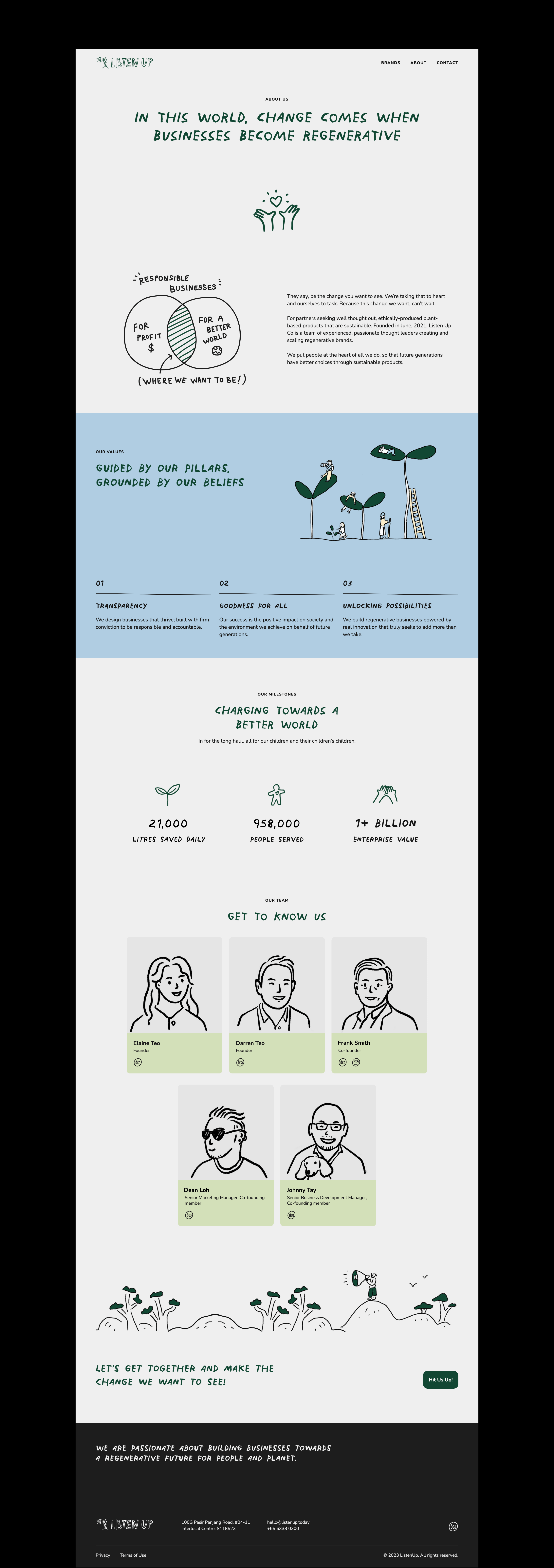 Founded in June 2021, Listen Up is a team of experienced, passionate thought leaders creating and scaling regenerative brands. As a holding company that wants to do things right, Listen Up seeks out ethical and sustainable businesses, guiding them to success. Their goal is to put people at the heart of all they do so that future generations have better choices through sustainable products.
