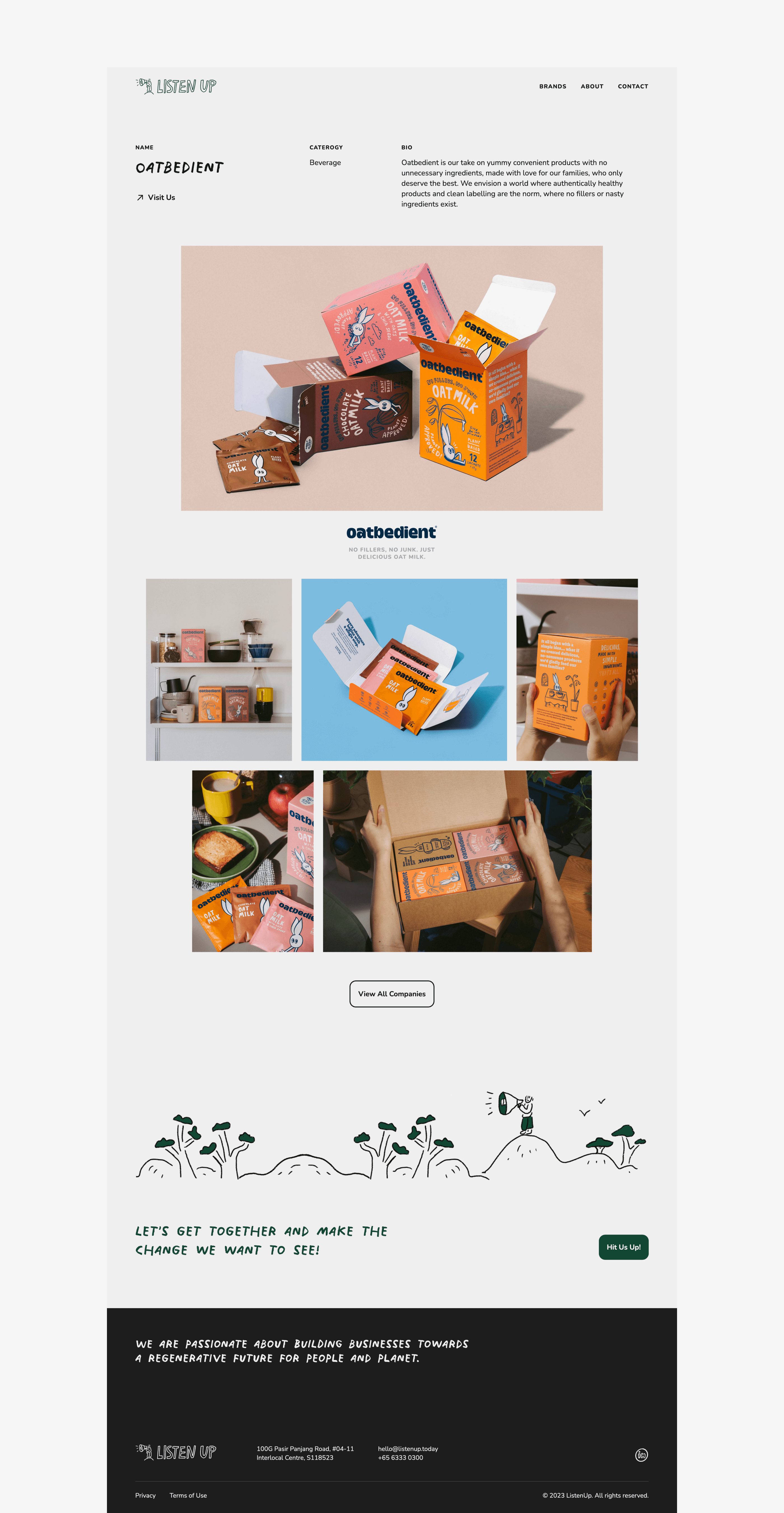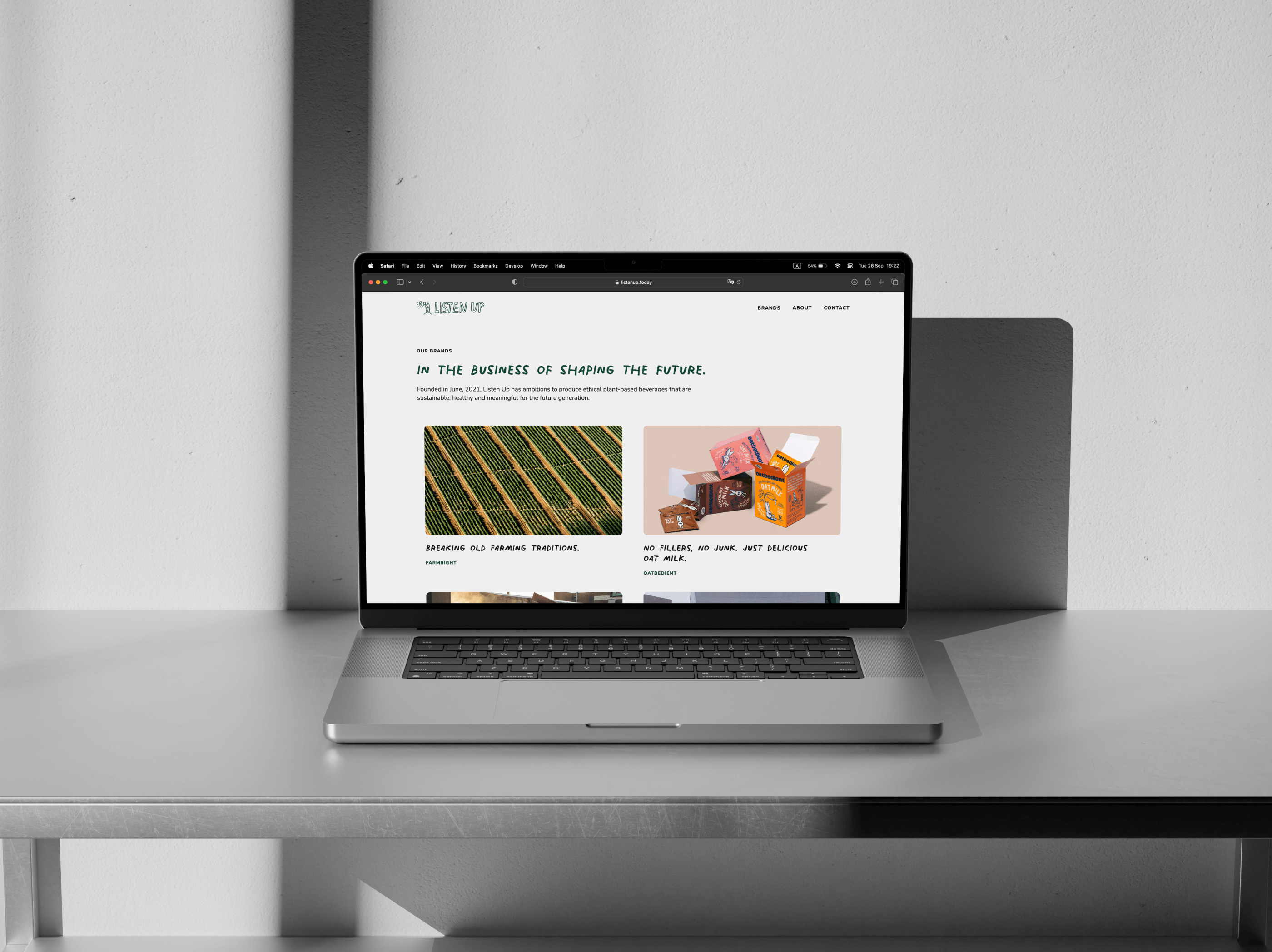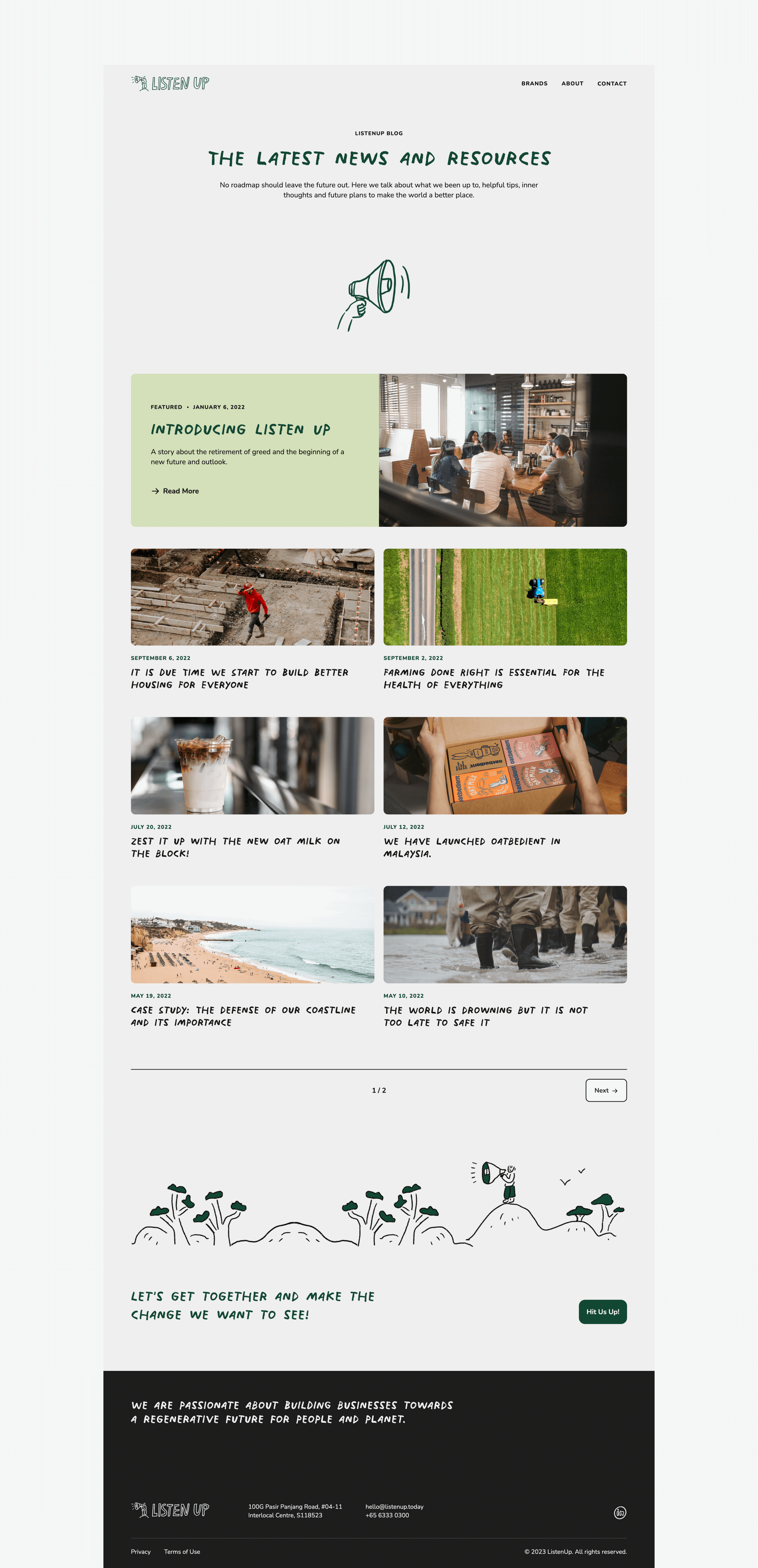 We kept their values and mission in mind when building out their site. Using their existing branding assets and adapting them to be more interactive, we designed a site that allows their companies and ideas to take the stage and shine. With that, the build becomes a platform that grows with Listen Up, getting their existing brands known while connecting them with like-minded businesses that want to do good.