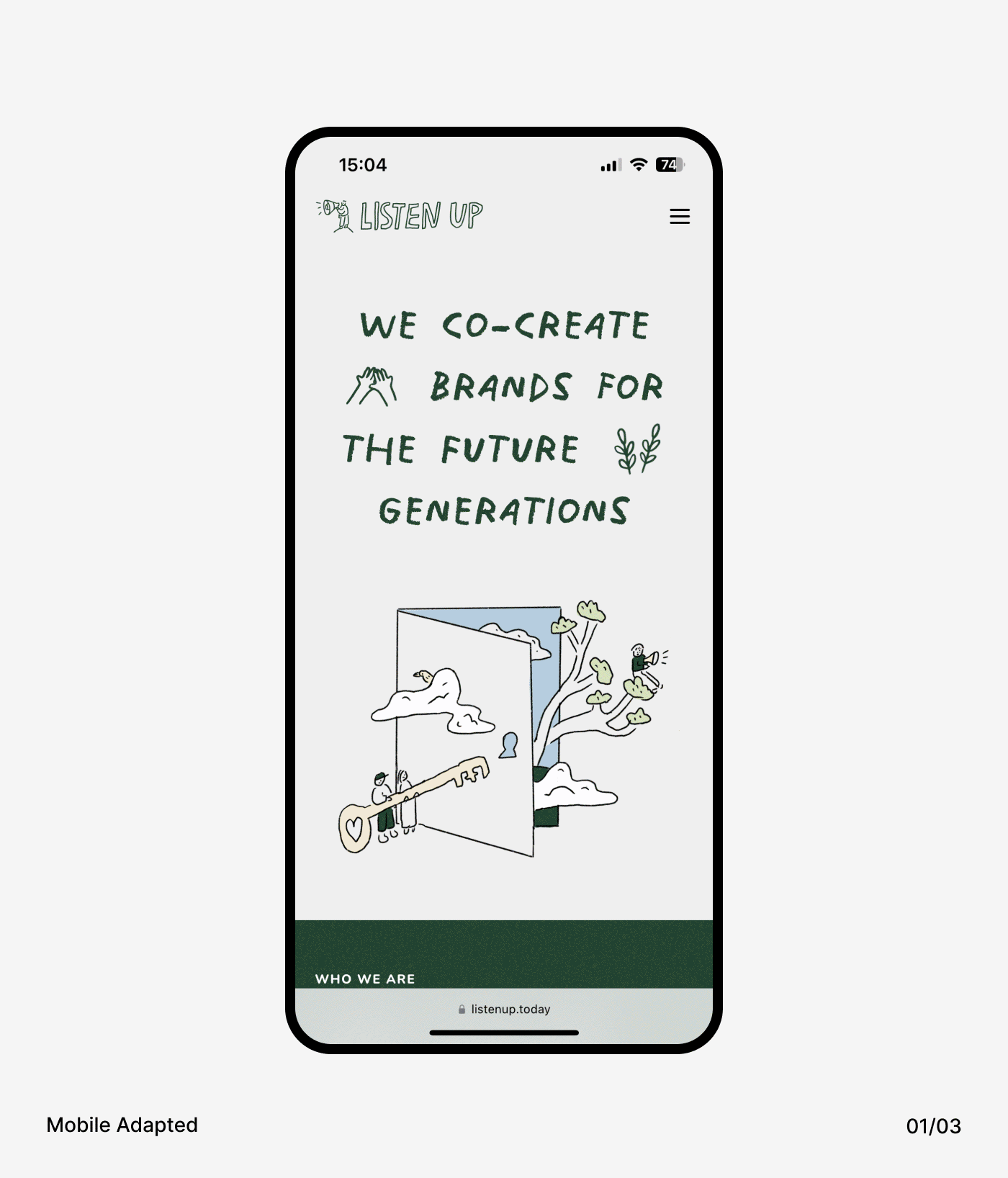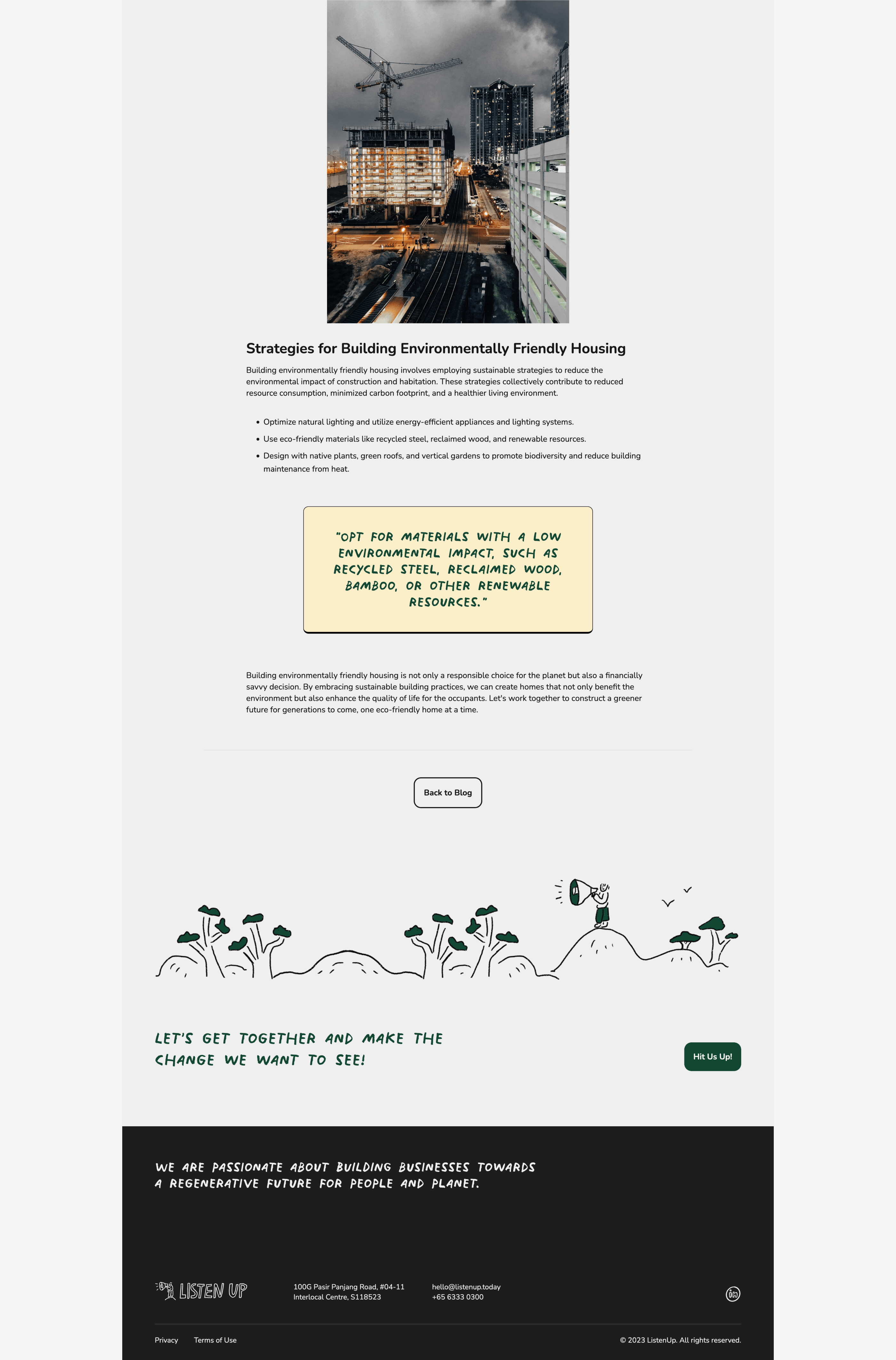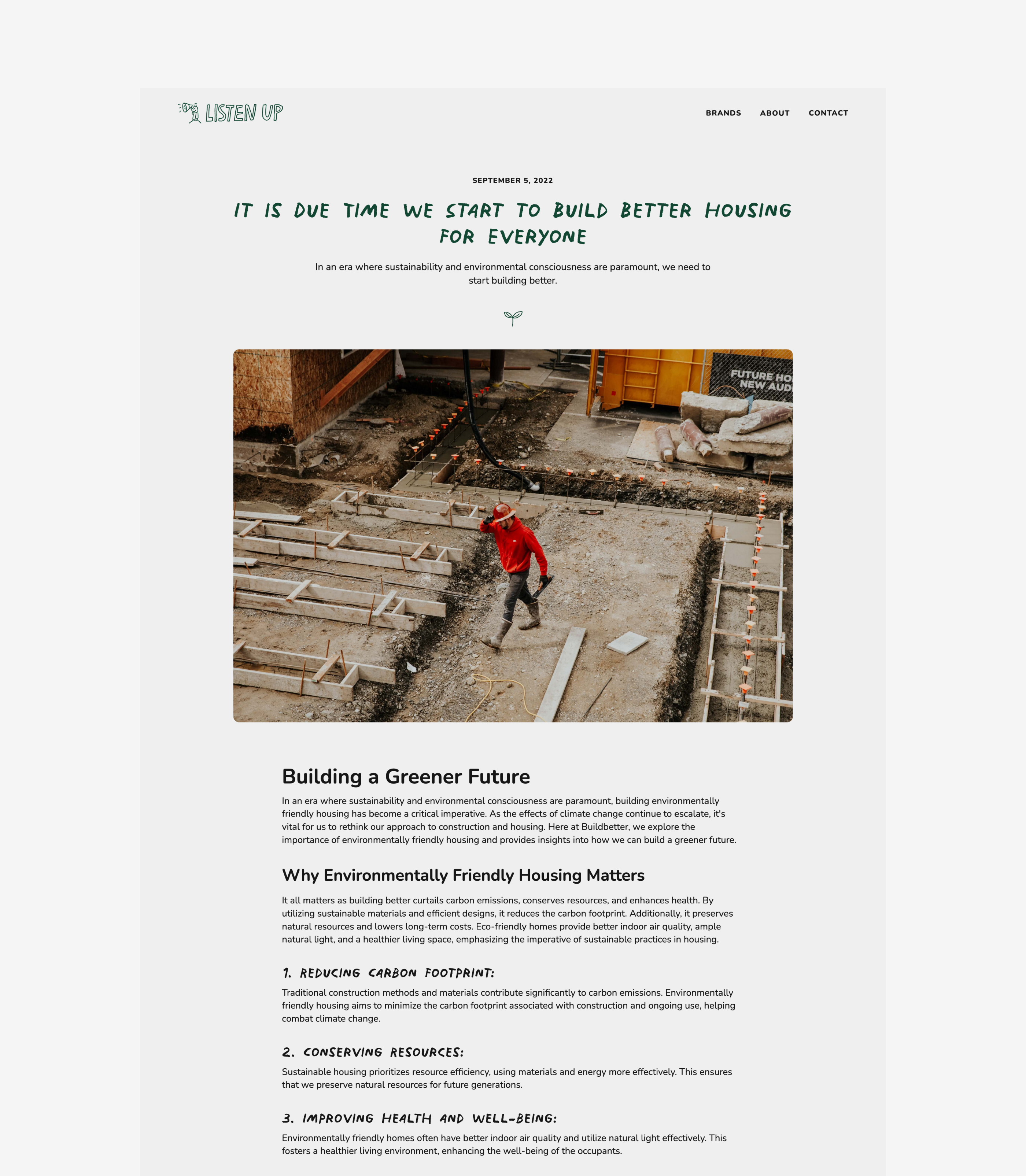 We kept their values and mission in mind when building out their site. Using their existing branding assets and adapting them to be more interactive, we designed a site that allows their companies and ideas to take the stage and shine. With that, the build becomes a platform that grows with Listen Up, getting their existing brands known while connecting them with like-minded businesses that want to do good.