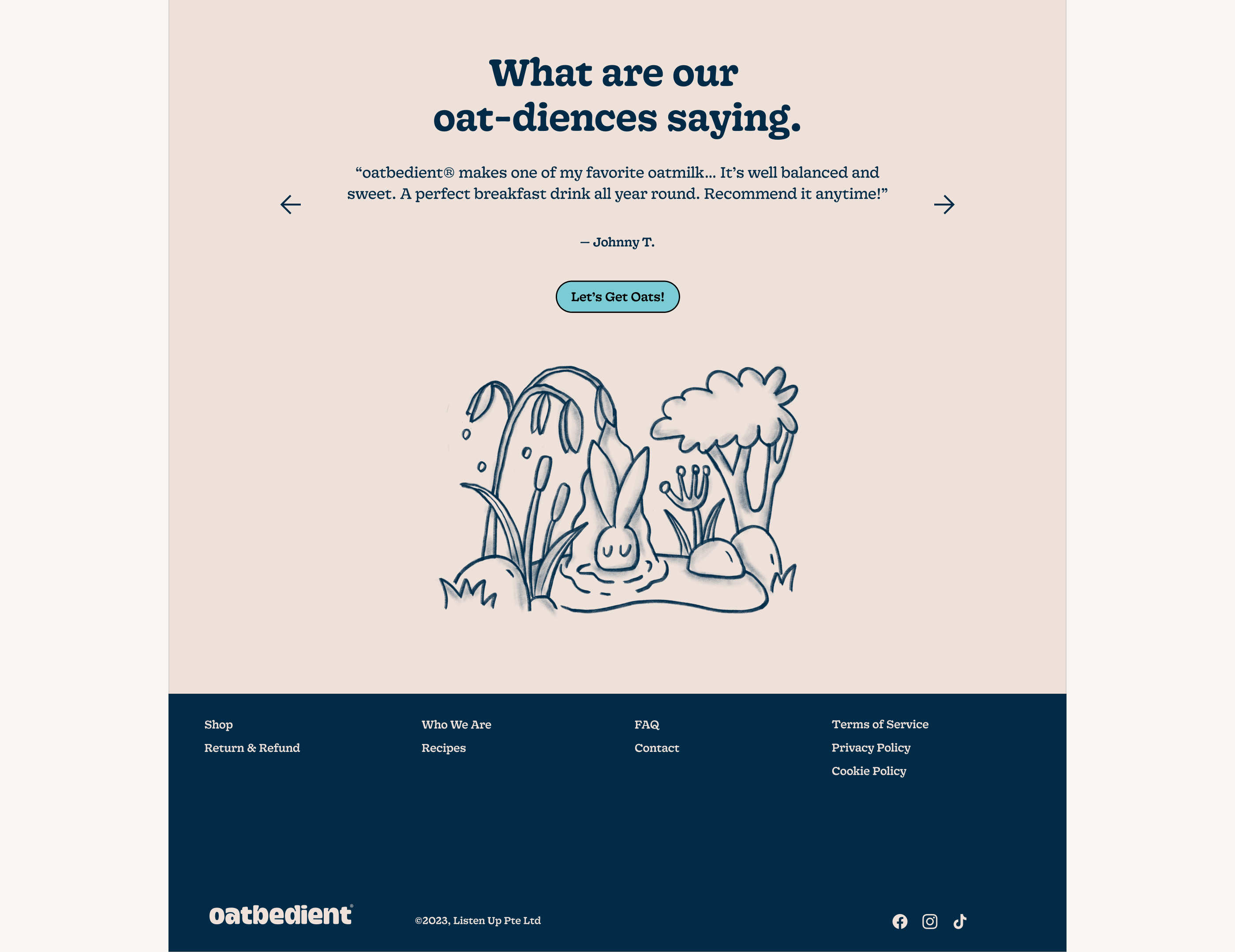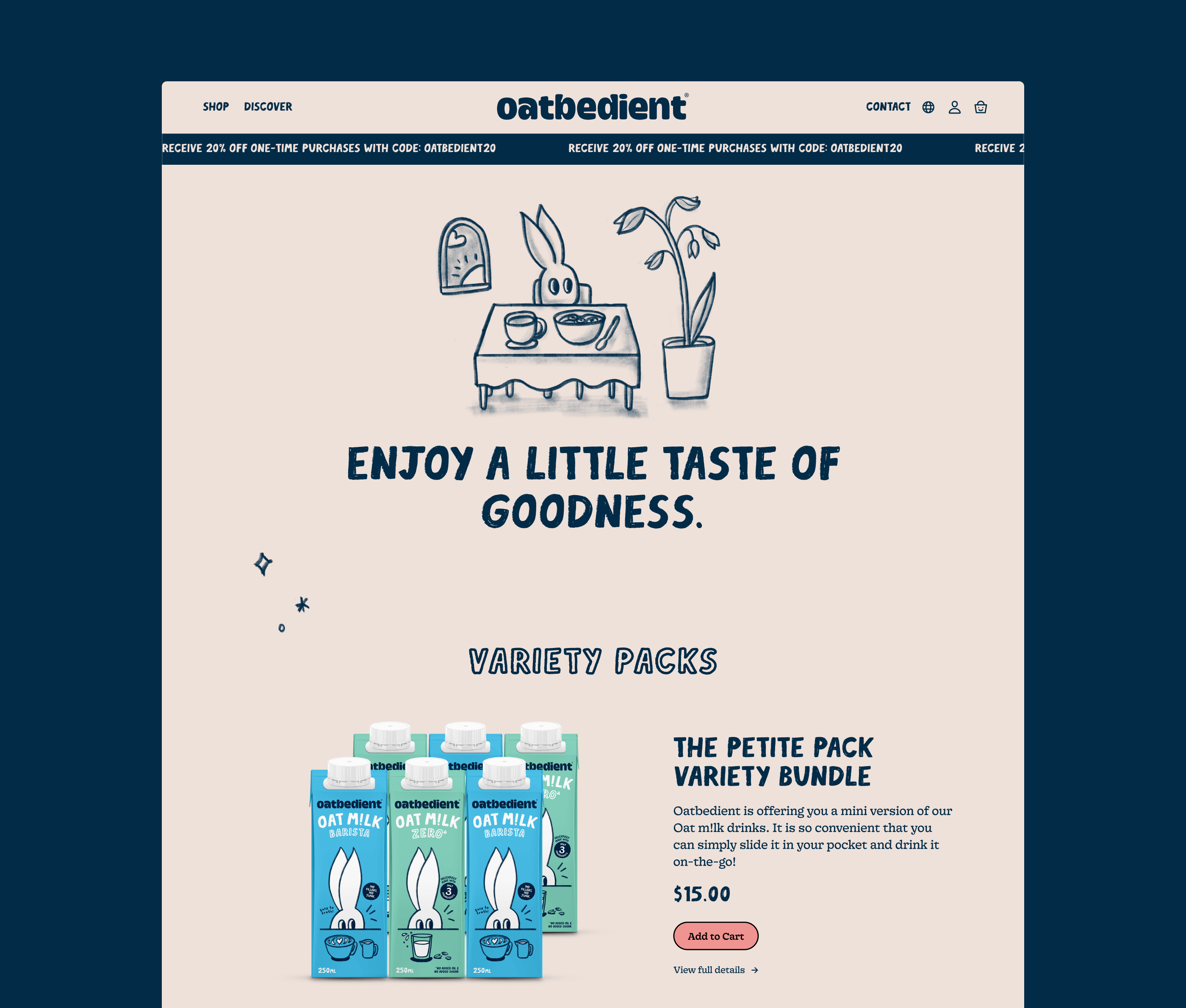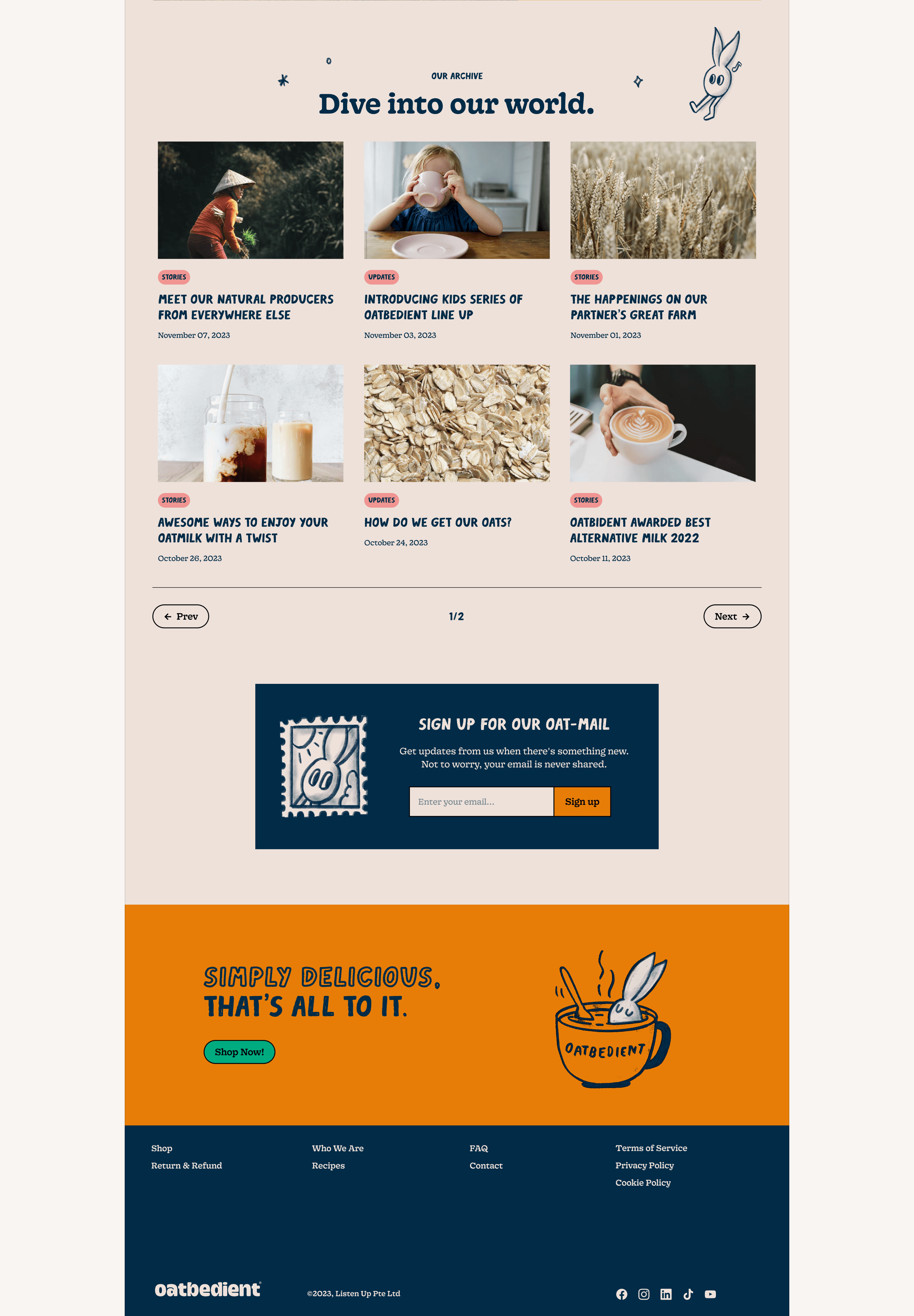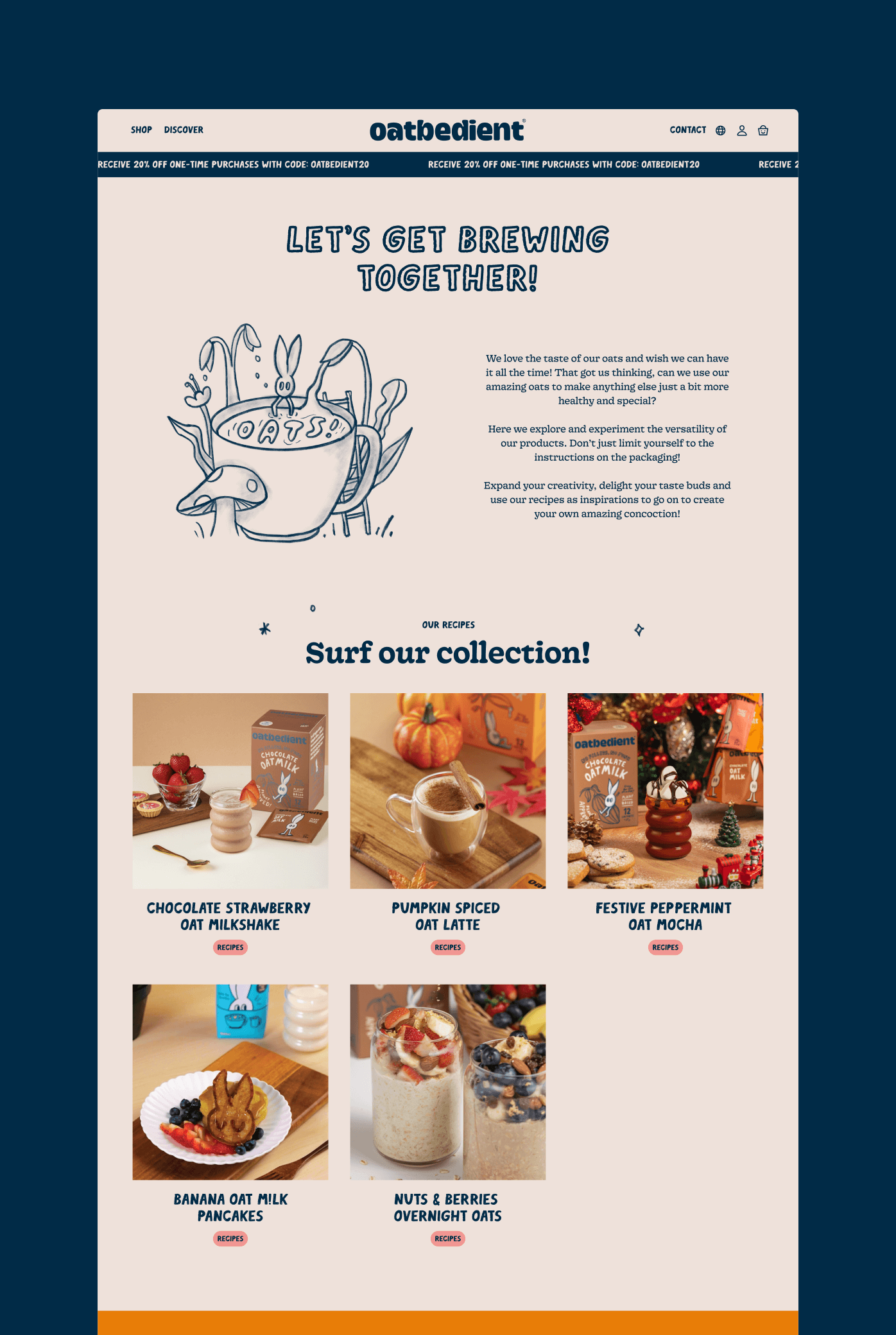 We helped translate their vision and personality into a site that showcases their sincere goal of making the world tastier and healthier. With the site, we built a home for Oatbedient's mascot, Oatdit, and made their digital presence even more personable and homely. We continuously collaborated with Oatbedient as their brand and product evolved, working together to better the world with deliciousness.
